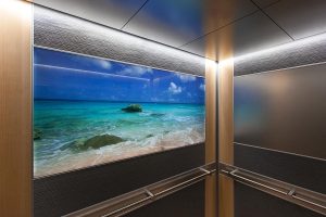 Ξεχάστε τον μονότονο και βαρετό σχεδιασμό και καλωσορίστε το ασανσέρ των ονείρων σας. Εδώ ο καθρέφτης αντικαθίσταται από μία εντυπωσιακή ταπετσαρία με θέα σε τροπικές ακτές, που μπορεί να βοηθήσει τον επιβάτη να χαλαρώσει κοιτώντας την. Αυτή η πρόταση είναι ιδανική για ανελκυστήρες μεγάλων εταιρειών ή κτιρίων γραφείων και αν μάλιστα συνοδεύεται από χαλαρωτική μουσική κατά τη διαδρομή (κοινή πρακτική σε ανελκυστήρες στους ουρανοξύστες της Νέας Υόρκης) τότε ξεχάστε το άγχος! Οι εργαζόμενοι σας θα φτάνουν στο γραφείο άλλοι άνθρωποι και η παραγωγικότητα τους θα ανεβαίνει κατακόρυφα.